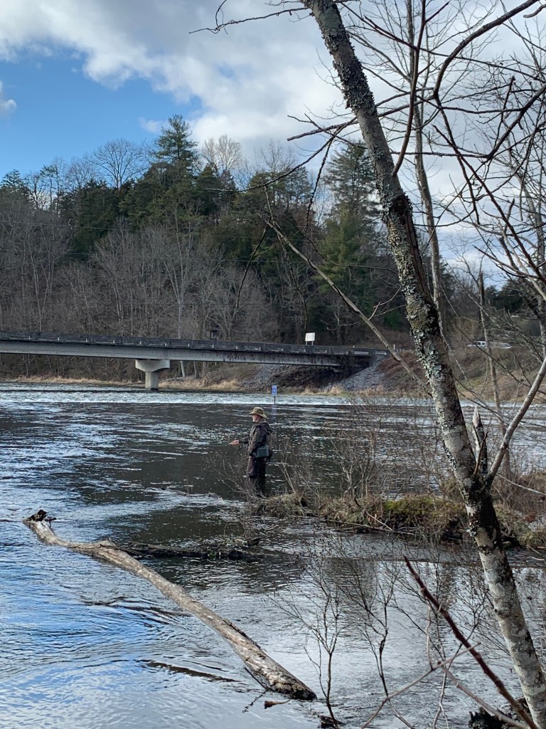 The next day brought very different weather. The rain of the evening before had ushered in a cold front. The temps were barely above freezing and the blue skies above and wind below made it clear we now had a high pressure system over top of our shoulders. The fishing was slow and the river was still fast. Anxious to employ the meticulous big-river nymphing lessons I had learned the night before, I found a nice seam about 15 feet out from the bank that looked inviting. I eased off of the bank onto a large flat rock submerged about 20” below the surface. I took two steps and the current swept my feet out from under me. I caught myself with my right arm. Turns out my arm was about the same length as the water was deep, which kept my head and left shoulder above water while my waders filled with cold South Holston water. I managed to continue fishing for about another 45 minutes because neoprene and wool are still warm when wet. However, they are still uncomfortable when wet and the fish were not biting – not even for my world champion nymphing partner – so I headed back to the cabin.