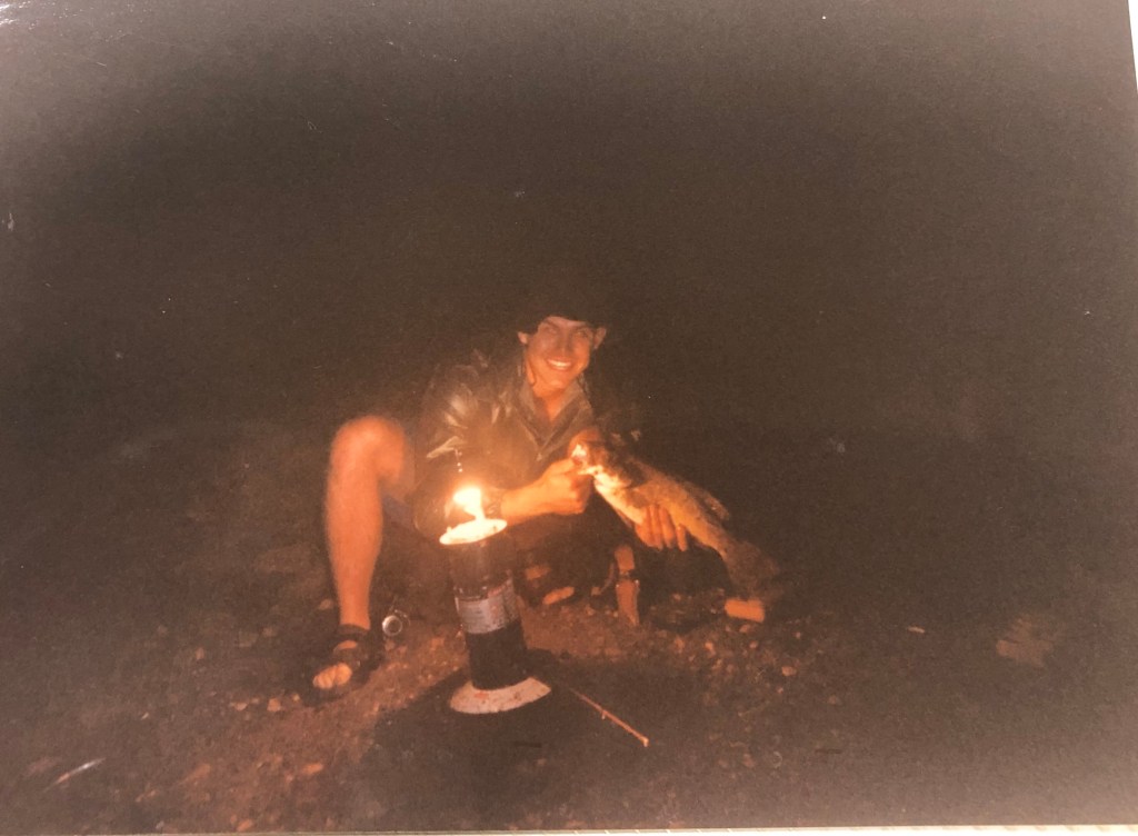 Standing there in the dark we had a quick conference and concluded that, since water runs downhill, the river must be somewhere at the bottom. If we would simply walk downhill far enough we would eventually hear water and, ta-da, find the river. So, off we went down the mountain through a subtle drawl, with cases of beer tied on top of our frame packs, Jeff with a cooler in one hand and fishing rods in the other, and me with a lantern in one hand and fishing rods in the other. We were the kind of backpackers that real backpackers make fun of.