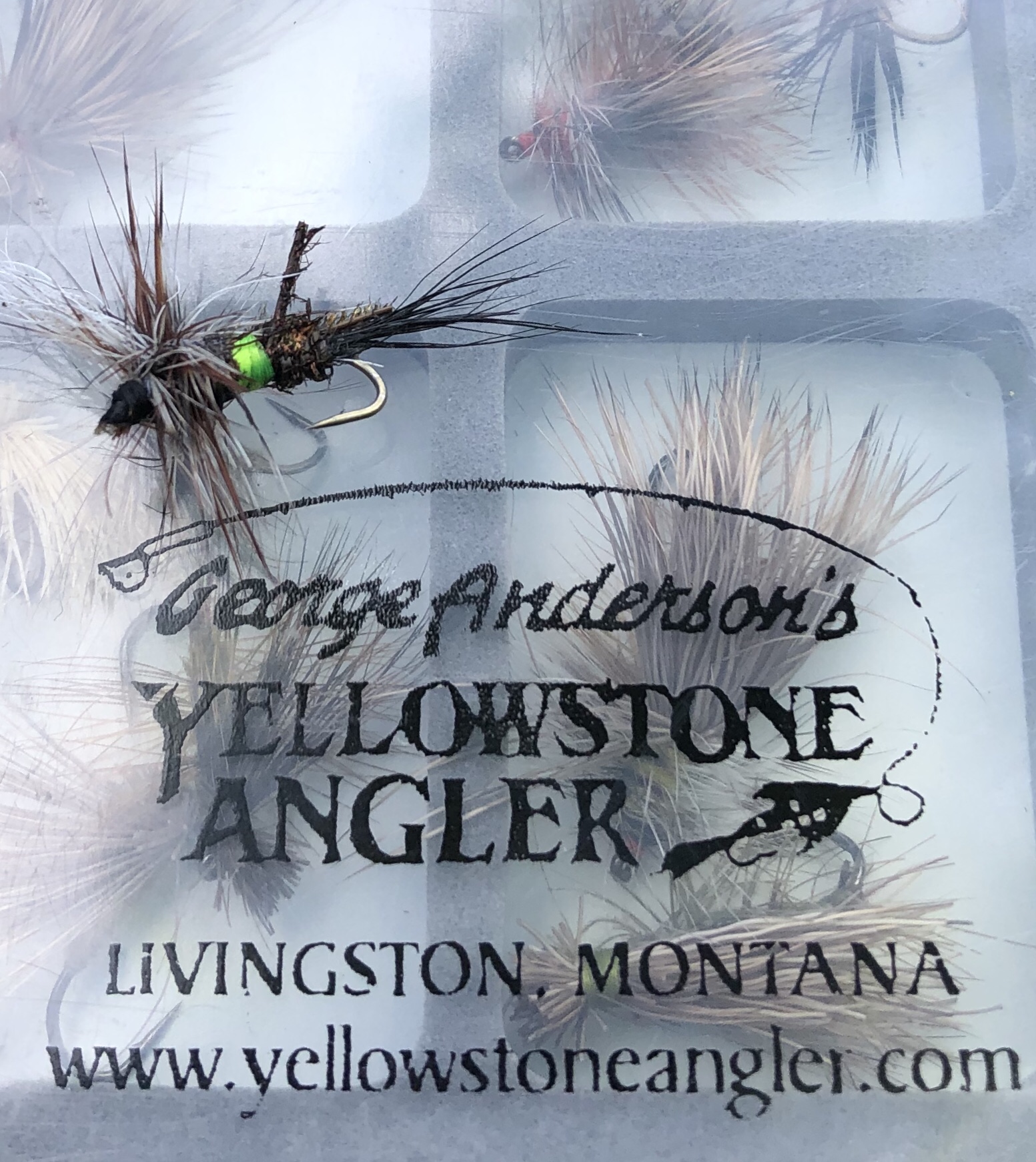 This well-worn royal wulff in bright green brought the most action. Caught four on it plus many hookups. The black bear tail gave it a unique touch.