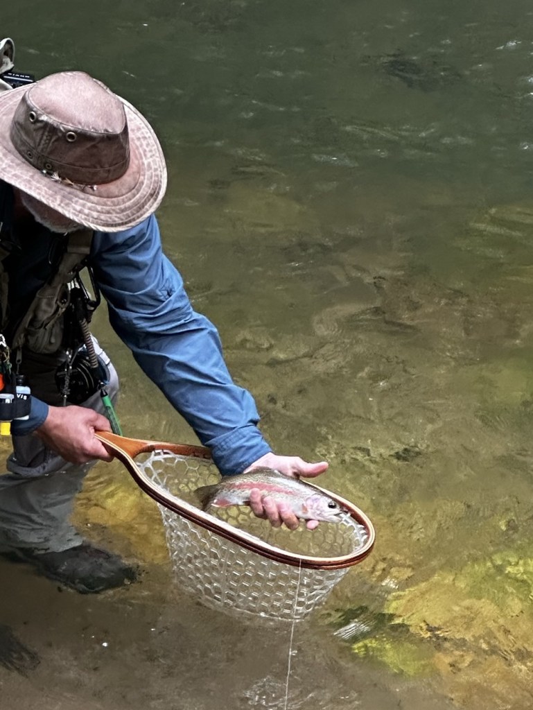 The trout is lifted from the water, its bright rainbow, silver skin, black spots, and hues of green glimmer in the late day light. The rhododendrons wave, the birds sing, the stream continues by. The hook removed, the trout returns to the depth of his pool. Calm returns to the water.