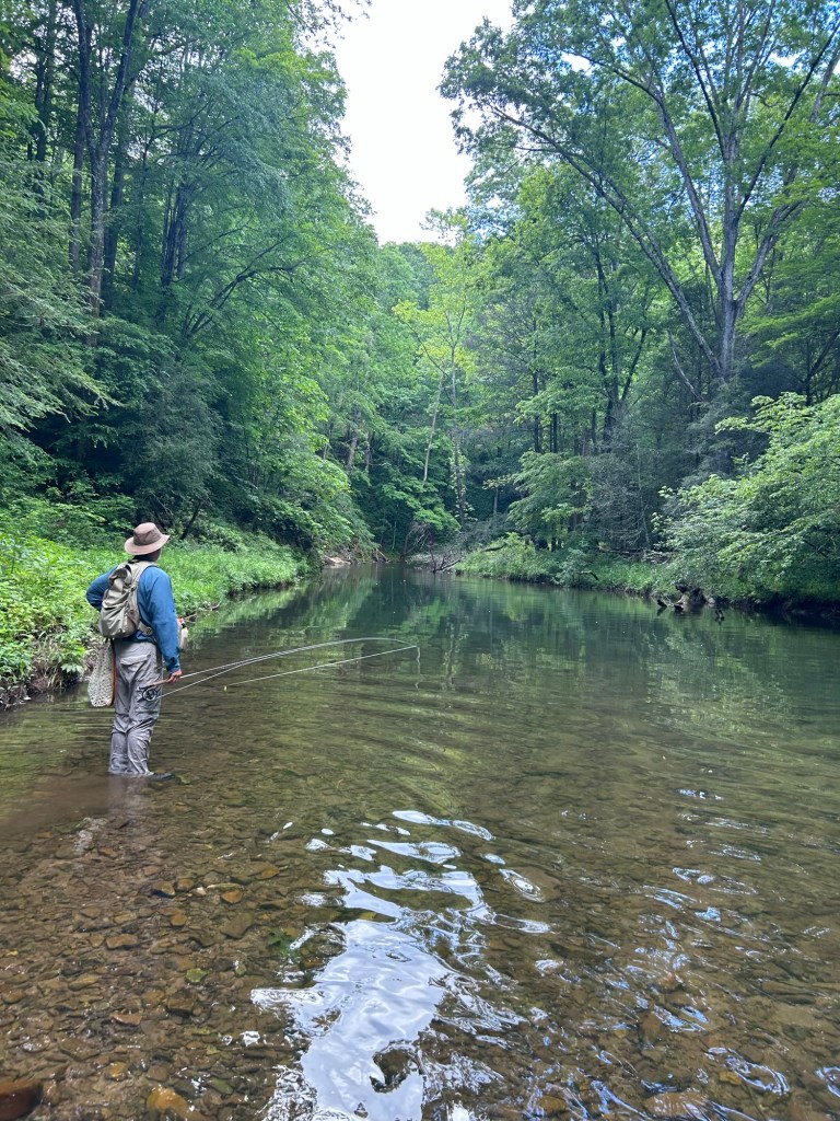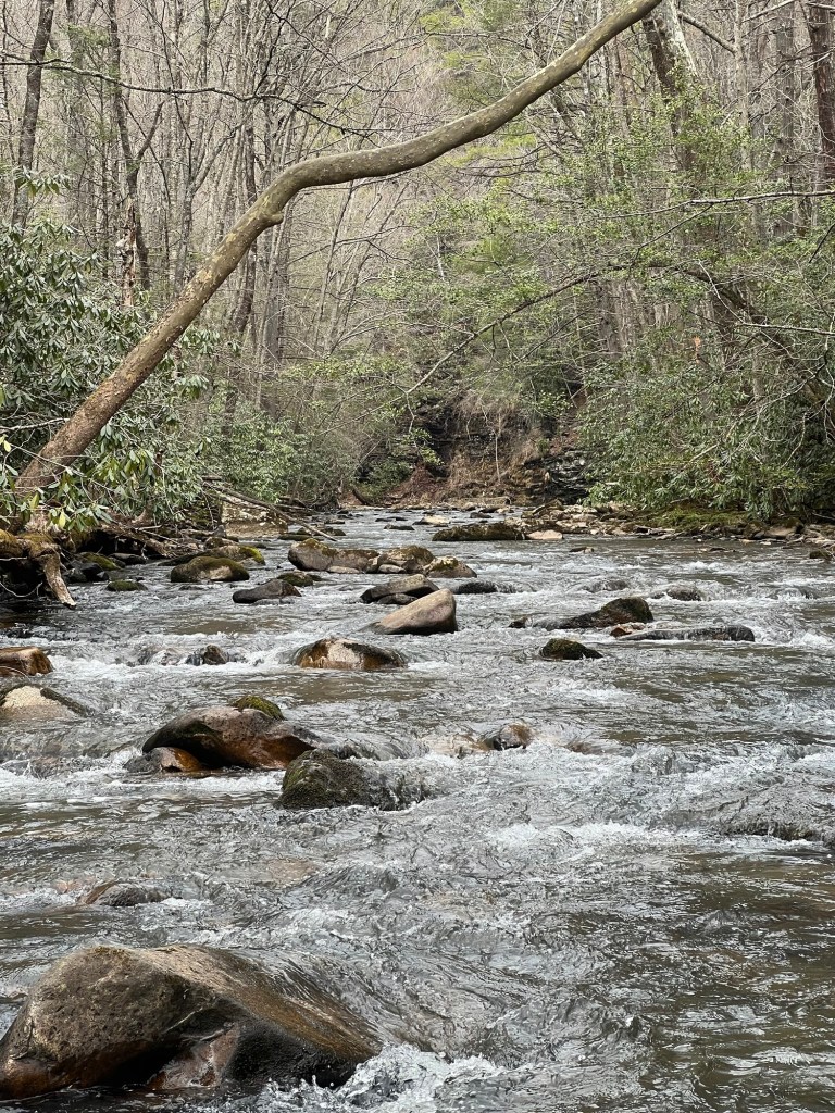 The stream flows gently over and around the rocks, originating from some mysterious place just out of sight. The wind rustles the rhododendrons and the white oaks overhead causing the sunlight to dance upon the pool just above the riffle. In the pockets of light mayflies dance upon the water, and a trout rises.